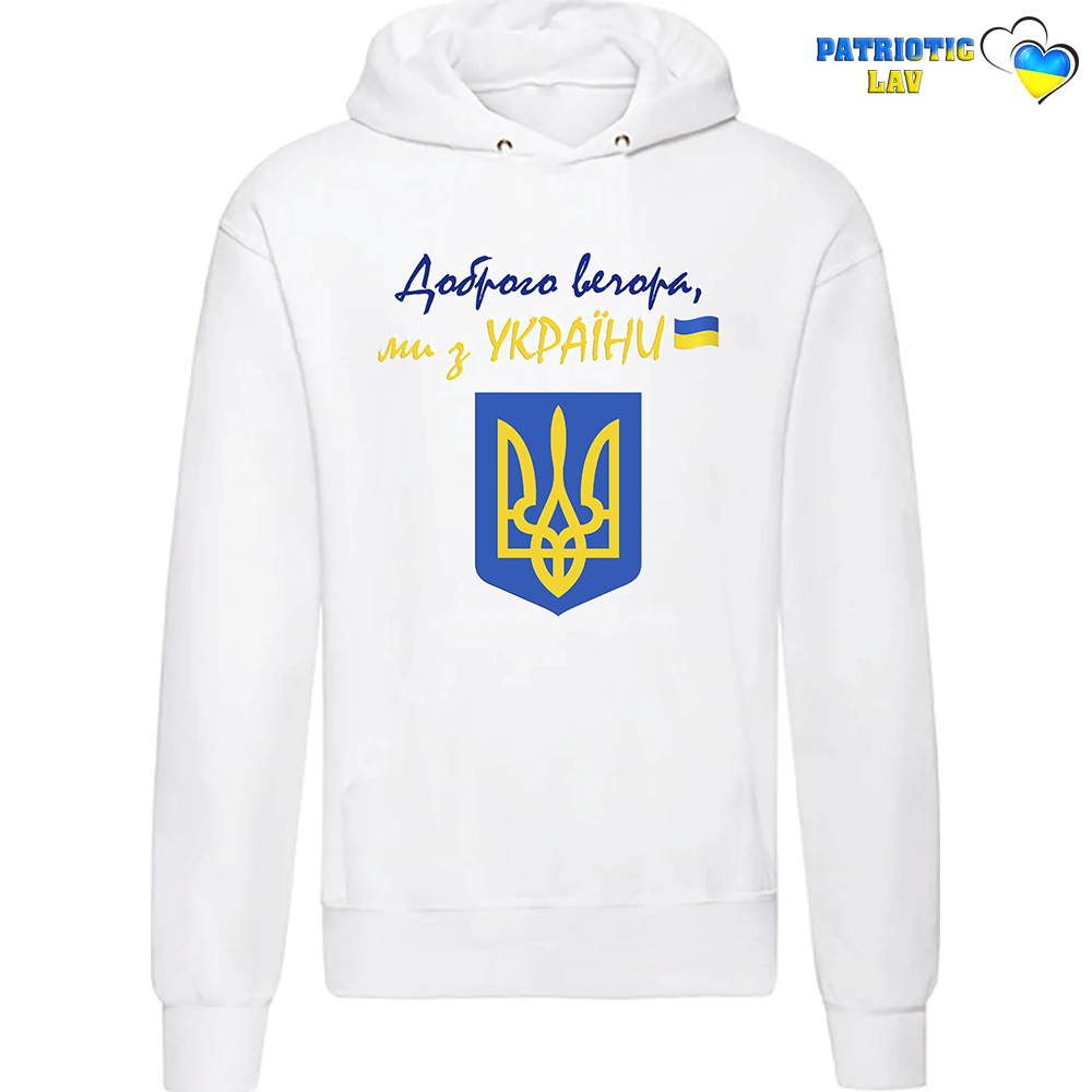Худі чоловічий білий " Доброго вечора, ми з України та герб"
